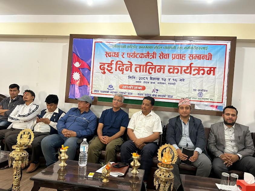 म्याग्दीको गलेश्वरमा होटल पर्यटनकर्मीहरुलाई दुई दिने ञपर्यटकमैत्री सेवाझ सम्बन्धि आवासीय तालिम प्रदान गरिएको छ । होटल व्यवसायी महासंघ गण्डकी प्रदेशको आयोजना र म्याग्दी होटल तथा रेष्टुराँ संघको सहआयोजनामा शनिबारदेखि सुरु तालिम आइतबार सम्पन्न भएको हो ।
