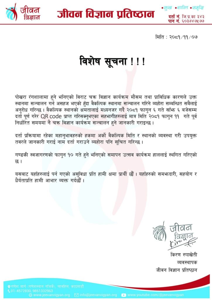 उक्त कार्यक्रमः अब हाल पोखरा रंगशालमा नहुने भएको छ । पोखरा रंगशालाको बैकल्पिक फुटवल (प्रशिक्षण) मैदान माचार केही दिन अघि प्रशारण भएकोमा चौतर्फी दबाब आएसंगै जीवन विज्ञान प्रतिष्ठानले हाल उक्त ठाउँबाट सो कार्यक्रम गण्डकी बाहेक अन्य क्षेत्रबाट सहभागि हुनेहरुको लागि स्थगित गर्दै गण्डकी प्रदेशको लागि करिब १ हजार जनालाई मात्र सहभागि गराउने तयारी गरेको छ ।