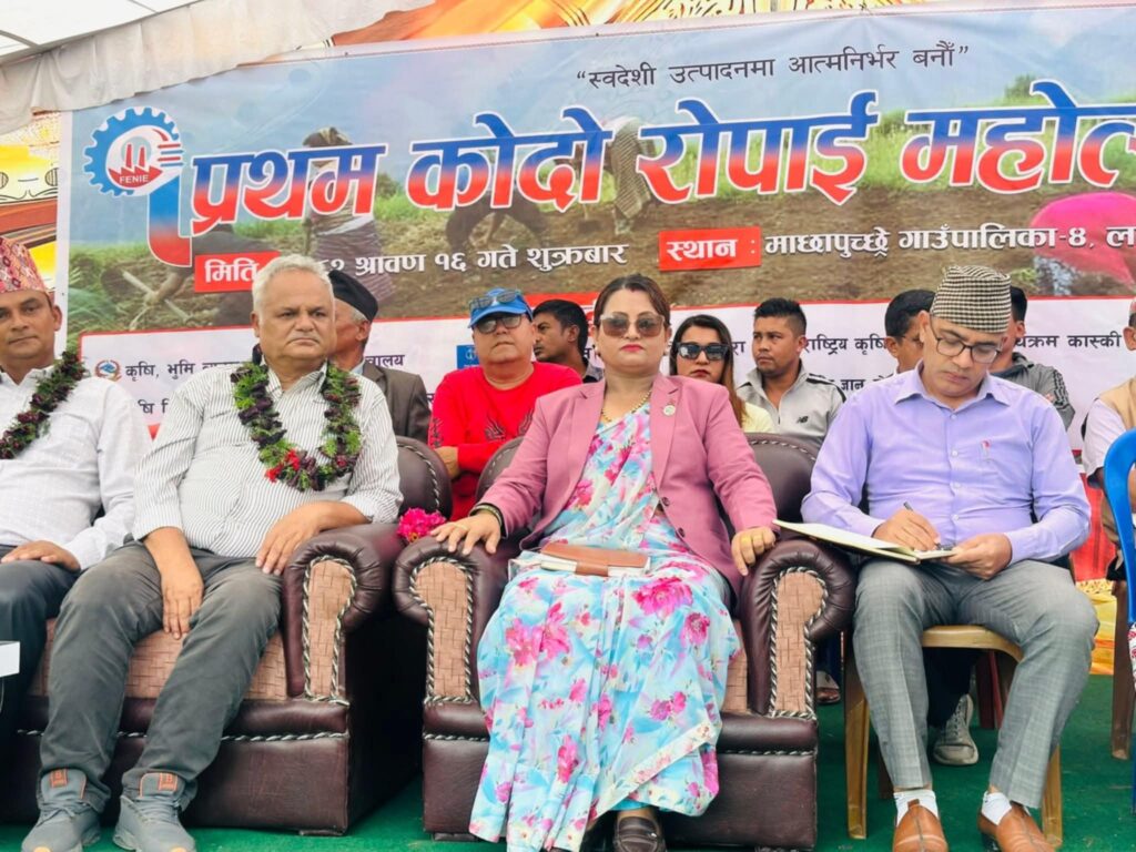 नेपाल उद्योग तथा व्यवसायी महासंघ गण्डकी प्रदेश÷कास्की जिल्ला÷माछापुुच्छ«े गाउँपालिकाको आयोजनामा राष्ट्रिय कोदो दिवसका अवसर पारी आज कास्कीको माछापुुच्छ«े गाउँपालिका वडा नं ४ लाहाचोकमा प्रथम कोदो रोपाइँ महोत्सव सम्पन्न भएको छ ।
