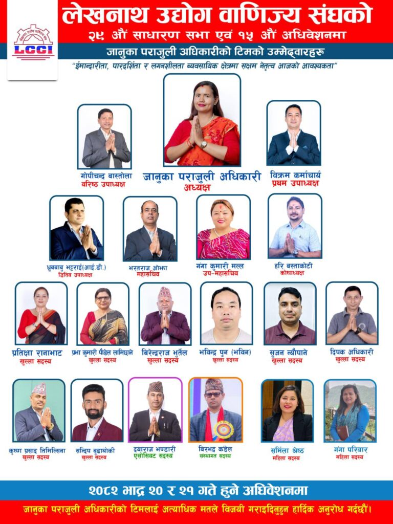 लेखनाथ उद्योग वाणिज्य संघको आगामी २९औं साधारण सभा तथा १५औं अधिवेशनमा पहिलो पटक महिला उम्मेदवार अध्यक्ष पदको दाबी सहित चुनावी मैदानमा उत्रिएकी छिन् । जानुका पराजुली अधिकारीले नेतृत्वले बिहीबार पत्रकार सम्मेलन मार्फत आफ्नो टिम घोषणा गर्दै संघको नेतृत्वमा पुग्ने प्रतिबद्धता जनाएकी हुन् ।
