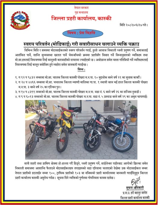 पर्यटकीय नगरी पोखरामा मोटरसाइकलको स्वरुप परिवर्तन (मोडिफाई) गरी अनधिकृत रूपमा सवारी साधन चलाउने ४ जना युवालाई प्रहरीले पक्राउ गरेको छ । ठुलो आवाज निकाल्दै ध्वनी प्रदूषण गर्ने, समाजमा आतंक फैलाउने तथा शान्ति–सुव्यवस्थामा खलल पु¥याउने कार्यमा संलग्न रहेको आरोपमा कास्की प्रहरीले ४ जना युवालार्ई नियन्त्रणमा लिएको जनाएको छ ।