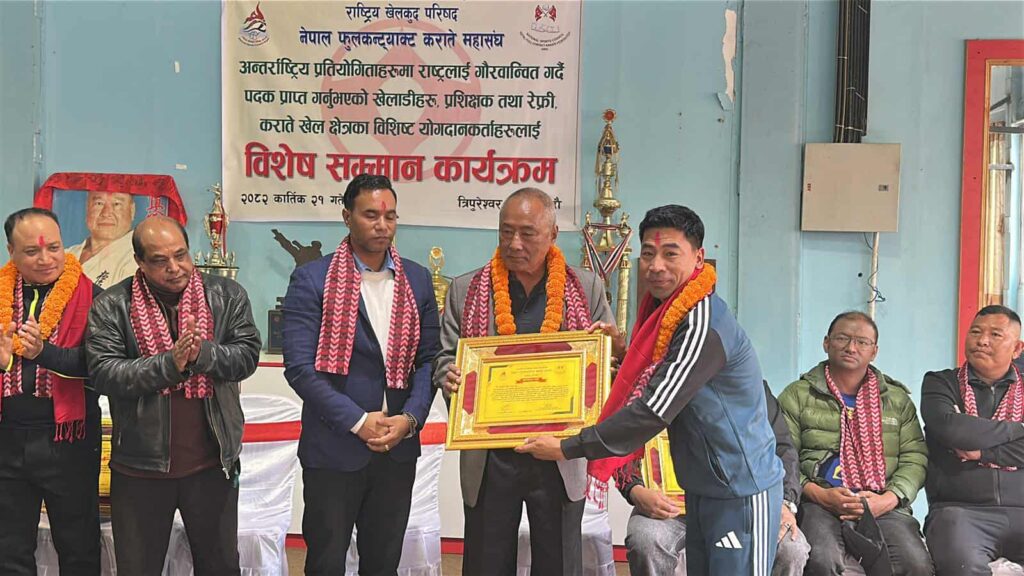 यसैबिच, फुलकन्ट्याक्ट कराते महासंघले अन्तर्राष्ट्रिय मञ्चमा नेपालको गौरव र पहिचान उच्च बनाउने खेलाडी, प्रशिक्षक तथा योगदानकर्ताहरूलाई विशेष सम्मान कार्यक्रममार्फत सम्मान गरेको छ। त्रिपुरेश्वर, काठमाडौंमा शुक्रबार सम्पन्न उक्त कार्यक्रममा कराते खेलका समर्पित प्रशिक्षक देव कुमार घिमिरे र अशोक लामा रुम्बालाई दीर्घकालीन योगदान र अन्तर्राष्ट्रिय स्तरमा राष्ट्रको नाम चिनाउन गरेको उत्कृष्ट भूमिकाको उच्च मूल्याङ्कनसहित सम्मान–पत्र प्रदान गरिएको थियो।