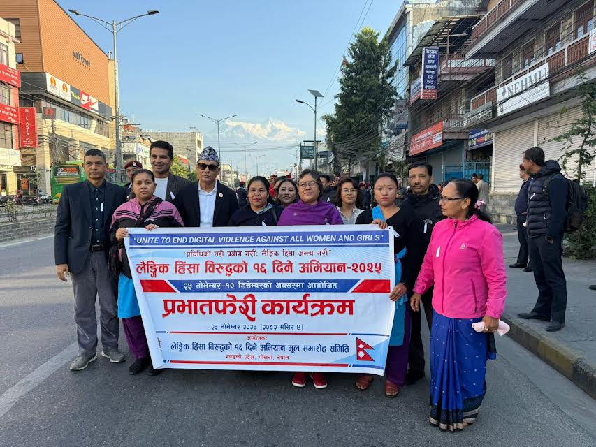 लैङ्गिक हिंसा विरुद्धको १६ दिने अभियान २०२५ अन्तर्गत आयोजित प्रभातफेरी कार्यक्रममा गण्डकी प्रदेशका सामाजिक विकास, युवा तथा खेलकुद मन्त्री विन्दु कुमार थापाले महिलामाथि हुने सबै प्रकारका हिंसा अन्त्यका लागि राज्यदेखि समाजसम्मको सामूहिक प्रतिबद्धता आवश्यक भएको बताएका छन्।