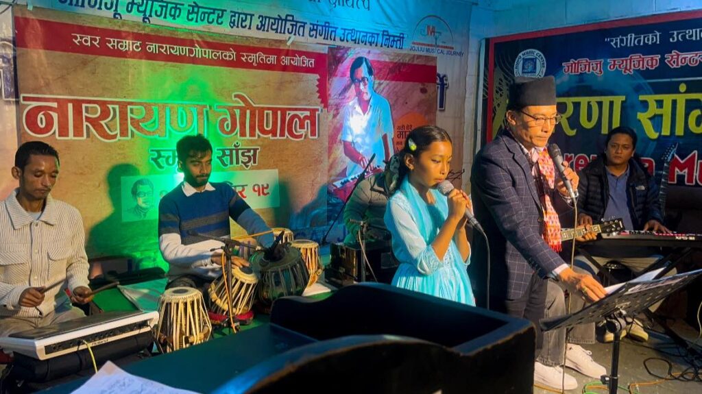 कार्यक्रममा विभिन्न साहित्य सङ्गीत संघ सस्था प्रतिनिधित्व गर्दै कलाकारहरुले नारायण गोपालका गीत सङ्गीत प्रस्तुति गरिएको थियो । यति धेरै माया दिई भोइलिन सानु जोजिजु, कसरी म भुले उत्प्रेम जोजिजु , तिम्रो मन मा बाल गायिका उत्प्रेरणा जोजिजु र बिनित जोजिजु, यो मुटु लाई पशुपति गुप्ता , उदास मेरो जिबन कथामा लक्ष्मी गिरी, मान्छेको मायामा नबराज बराल र पिङ्गला भट्ट , तिमिलाइ म के भनु मा फिरोज गोपाल बज्राचार्य , म त लालीगुराश भएछु मा रोम तमाङ्ग, मेरो आखा लाई राख्ने मा बिष्णु थापा ,आज भोलि दुख्दैन मा कोमन गुरुङ , केहि मिठो बात गर मा सुमन भण्डारी, बिरताको चिनो मा राजन बराल ले गायन प्रस्तुति दिएको थिए । त्यसै गरी बाध्यबादकहरुमा हार्मोनियम पप्पु थापा मगर , तबला मिलन गिरी , किबोर्ड पाण्डव गुरुङ, प्याड ड्रम कृष्ण सेन्चुरी र गीतारमा उत्प्रेम जोजिजुले साथ दिएका थिए ।