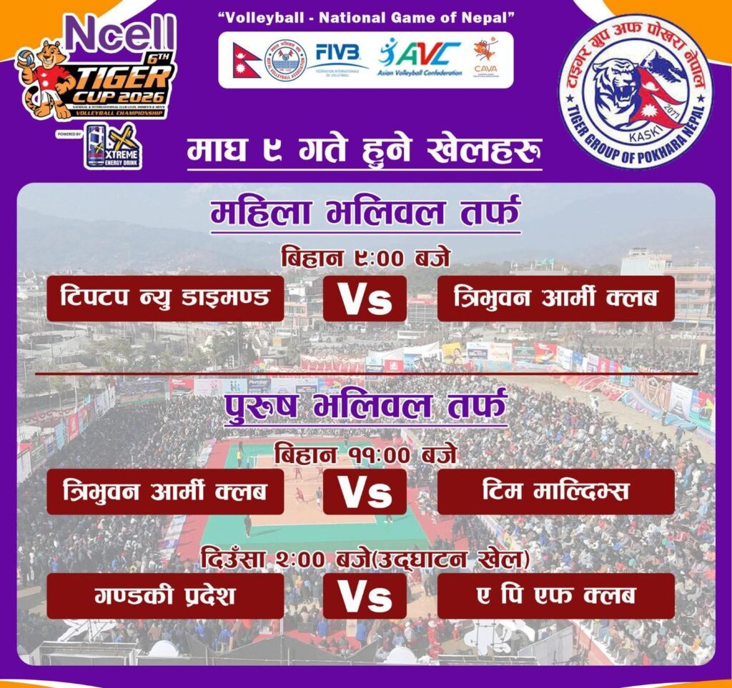 शुक्रबार दिउँसो २ः०० बजे पछि पुरुष तर्फको गण्डकी भलिवल संघ बिरुद्ध शसस्त्र प्रहरी वलको एपिएफ क्लव बिच खेल हुने भएको आयोजकले जनाएको छ । विहिबार महिला तर्फ विहान ९ः०० बजे टिपटप न्यू डायमण्ड स्पोट्र्स क्लब र विभागिय टोली त्रिभुवन आर्मी क्लव बिचको खेल हुने भएको आयोजक टाइगर ग्रुप अफ पोखरा नेपालका अध्यक्ष नारायणप्रसाद शर्माले बताउनु भयो । विहिबार पुरुष तर्फ त्रिभुवन आर्मी क्लव बिरुद्ध पाहुना टोली माल्दिप्सको राष्ट्रिय टोलीसंग प्रतिष्प्रर्धा हुने भएको छ । यही माघ १७ गतेसम्म संचालन हुने प्रतियोगितामा विदेशी सहित महिला तर्फ ५ र पुरुष तर्फ भने ६ टिमको सहभागिता हुने भएको छ ।