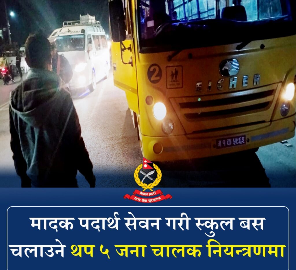 पोखराका विभिन्न स्थानबाट स्कुल बस चालकहरूले मादक पदार्थ सेवन गरी सवारी चलाउने गरेको जनगुनासो आएपछि आज ९मंगलबार० बिहान करिब ४ बजे ट्राफिक प्रहरीसहित संयुक्त चेकिङ टोली परिचालन गरिएको थियो। चेकजाँचका क्रममा पाँच जना चालक मापसे गरेको पुष्टि भएपछि नियन्त्रणमा लिई आवश्यक कारबाही प्रक्रिया अघि बढाइएको कास्कीका सूचना अधिकारी हरिबहादुर बस्नेतले बताउनु भयो ।नियन्त्रणमा परेकामा रत्न ज्योति बोर्डिङ स्कुलको ग १ क ५९६२ नम्बर बसका चालक गोविन्द क्षेत्री, केईएफ सेकेन्डरी स्कुलको ग १ क ४७६३ नम्बर बसका चालक सर्वजित रेग्मी, गुरुकुल विद्याश्रम बोर्डिङ स्कुलको ग १ क १९५७ नम्बर बसका चालक दलबहादुर सुनार, इमानुयल बोर्डिङ स्कुलको ग १ क ५००८ नम्बर बसका चालक मनबहादुर तामाङ र गण्डकी बोर्डिङ स्कुलको ग १ क ६६२३ नम्बर बसका चालक रोनिश खनाल रहेको जिल्ला प्रहरी कायालय कास्कीले जारी गरेको प्रेस विज्ञेप्तिमा उल्लेख गरिएको छ ।