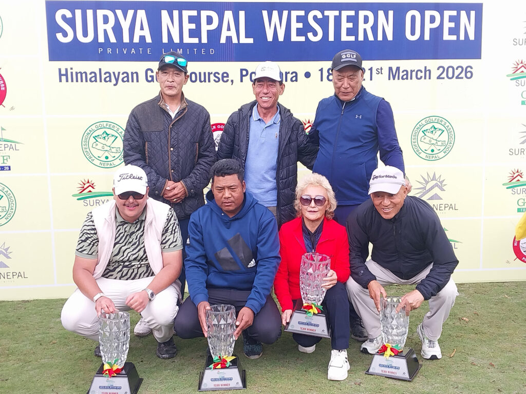 सूर्य नेपाल वेस्टर्न ओपन प्रो एमको उपाधि प्रो सञ्जय लामाको टिमले १ सय ३९ अंक सहित जितेको छ। सञ्जयले ३४ अंक बनाउँदा एमेच्योर खेलाडीहरू सत्यजोत रानाले ३९, गीता गुरुङले ३५ र टेण्डी शेर्पाले ३१ अंक बनाए।