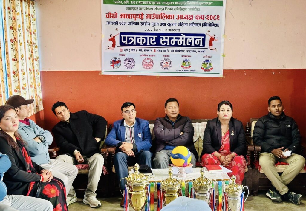 कास्कीको माछापुच्छ«्रे गाउँपालिका–४, लाहाचोकमा यही चैत ११ गते (बुधबार) देखि चौथो संस्करणको माछापुच्छ्रे« गाउँपालिका अध्यक्ष कप गण्डकी प्रदेश पालिका स्तरीय पुरुष तथा खुल्ला महिला भलिबल प्रतियोगिता–२०८२ हुने भएको छ । माछापुच्छ«्रे« गाउँपालिका खेलकुद विकास समितिको आयोजनामा माछापुच्छ«े गाउँपालिका वडा नं–४,लाहाकोको व्यवस्थापन उक्त प्रतियोगिता चैत १४ गतेसम्म संम्म संचालन हुने भएको सोमबार पत्रकार सम्मेलन मार्फत जानकारी गराइएको हो ।