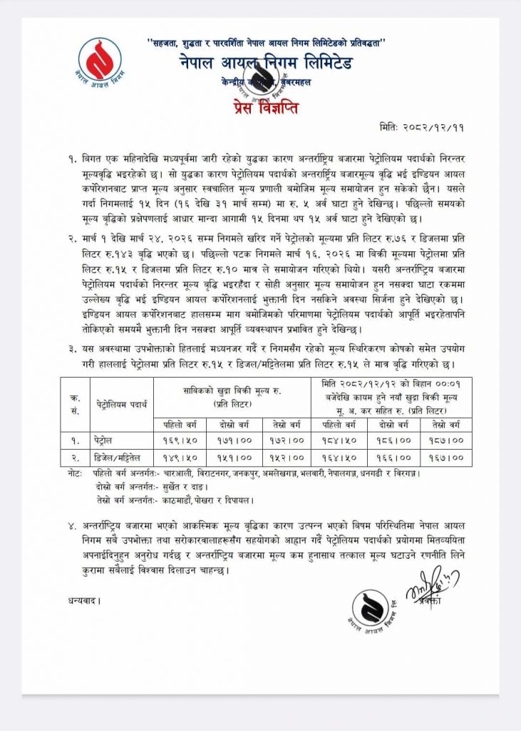 दुई साता नहुँदै पुनः पेट्रोलियम पदार्थमा भारी मूल्यवृद्धि, डिजेल–मट्टितेल र पेट्रोलको मूल्यमा प्रतिलिटर १५ रुपैयाँ वृद्धि