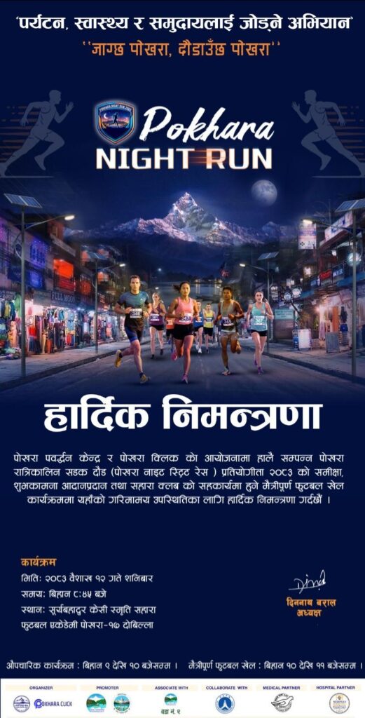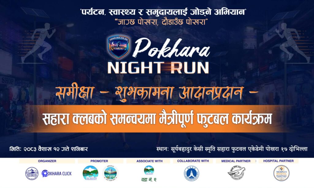 “जाग्छ पोखरा, दौडाउँछ पोखर” भन्ने मूल नारासहित आयोजित पहिलो “पोखरा नाइट स्ट्रिट रेस २०८२÷०८३ गत चैत २८ गते सम्पन्न दौडमा नेपालसहित पाँच देशका १४५ जना धावकहरुको सहभागिता रहेको थियो । खुलातर्फ दार्चुलाका मुकेश थापा विजेता बन्दा पर्वतका सुवास गुरुङ दोस्रो र अकलबहादुर पालले तेस्रो स्थान प्राप्त गर्न सफल भएका थिए । विदेशी विधातर्फ फ्रान्सका स्याम्यूलले उत्कृष्ट प्रदर्शन गर्दै प्रथम स्थान हासिल गर्न सफल भएका थिए भने महिलातर्फ पुष्पा शर्मा लिम्बु र यू–१६ विधामा राम ढुंगाना विजेता भएका थिए ।